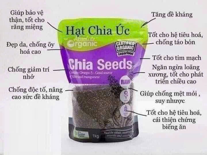🌸🌸🌸Hạt Chia Úc - Organic Chia Seeds Sale #155kkk/bịch 1kg 🌸THÀNH PHẦN: Hạt chia hữu cơ 100% 🌸CÔNG DỤNG: – Giúp ổn định huyết áp – Chống đông máu – Tăng cường sức khỏe, giúp các cơ bắp trở nên săn chắc, mạnh mẽ hơn. – Hạt Chia còn bổ sung năng lượng, hỗ trợ sự vận động của các khớp. – Hạt chia giúp cho người tiểu đường: hạt chia giúp hỗ trợ ổn định đường huyết, hạn chế tình trạng thèm đồ ngọt. – Hạt chia giúp chống ung thư đường ruột – Hạt chia bảo vệ tim mạch – Hạt chia giúp giảm cân – Hạt chia thích hợp cho người ăn chay và người bị tiểu đường. Lọc sạch mọi độc tố trong cơ thể